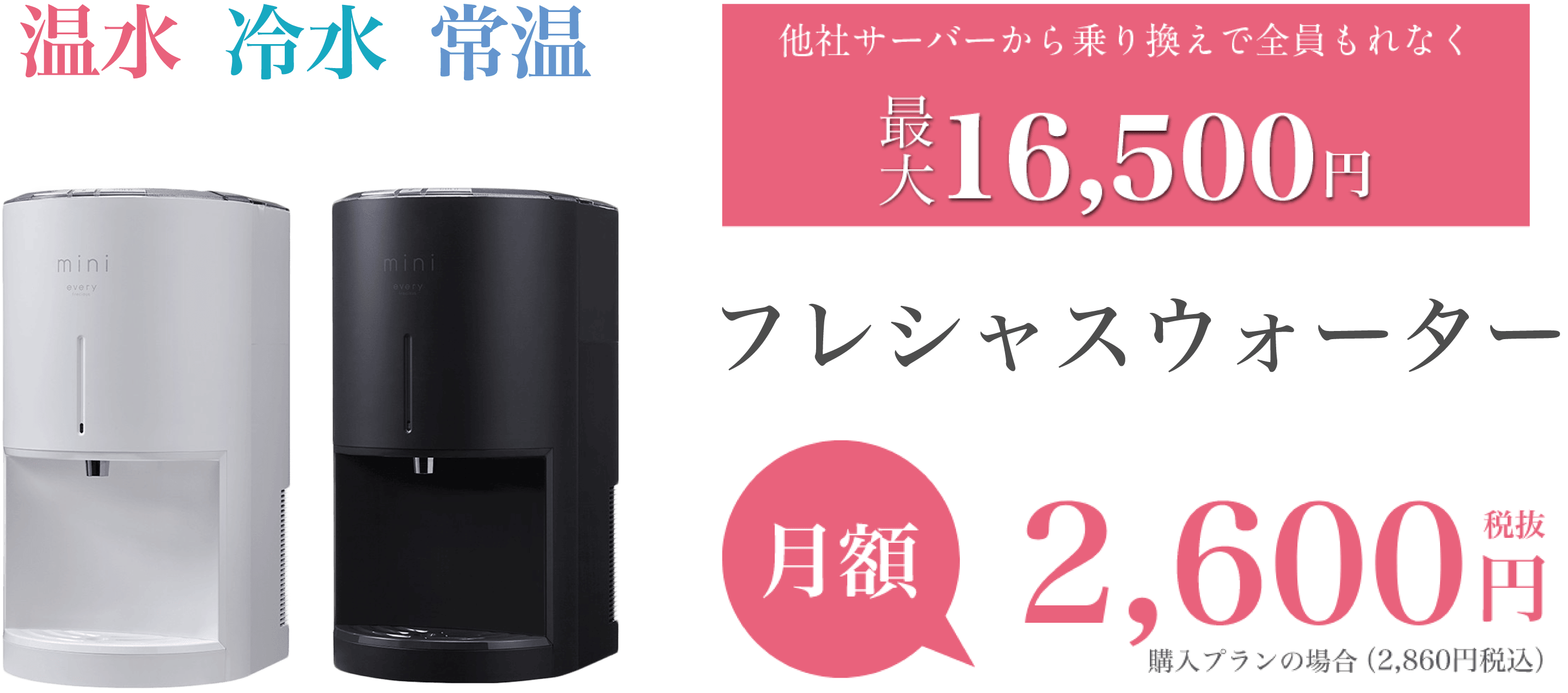 1ヶ月の平均的なウォーターサーバーの電気代は一般的なボトルタイプなどで約1,200円。エブリィフレシャスのサーバーは省エネモード を搭載しており、このモードを使用した場合で月にかかる電気代を最大約70%カットします。every frecious mini約410円/月