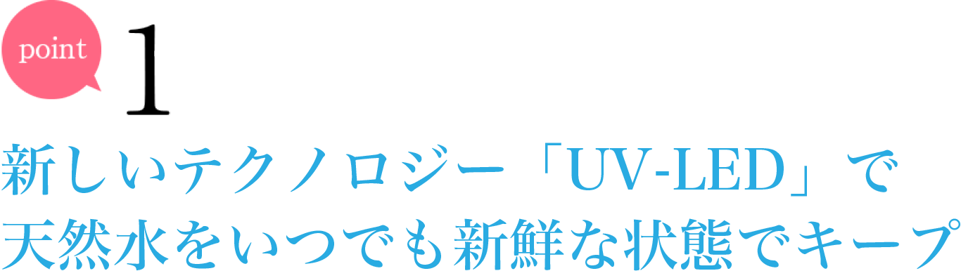 ウォーターサーバー業界では初めてUV LED」を搭載、サーバー内のクリーニングなど特別な操作をする必要がなくサーバー内を 定期的に殺菌効果のある光で照射してくれるので、いつでも天然水生新鮮な状態に保ちます。動作中も冷水浄水ともに給水できるため飲みたいときにすぐ使えます。