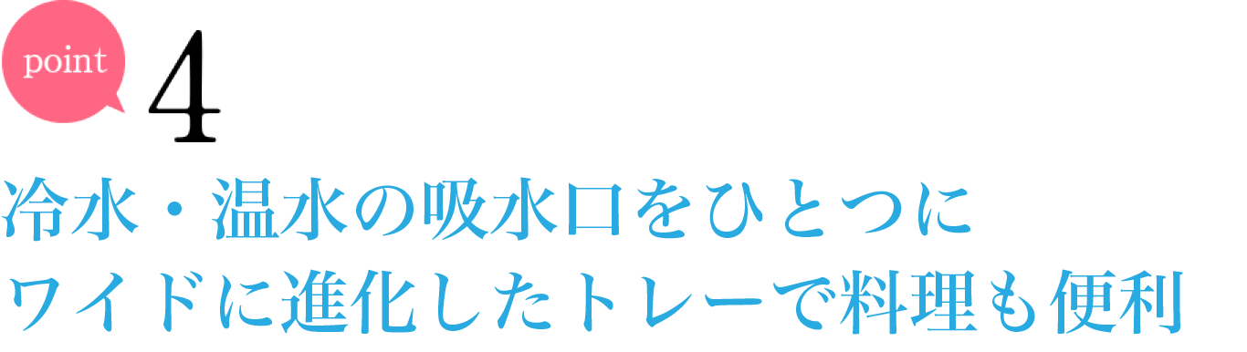 冷水・温水の吸水口を一つにまとめ従来のような 操作レバーを排除。見た目がすっきりしただけでなく、吸水口周りのお手入れも簡単になりました。 さらに多く奥行きが取れるようになったことでトレーもワイドに進化。これまでの間口が 狭くて入れなかったフライパンや鍋など調理器具もストレスなくお水を注げます。