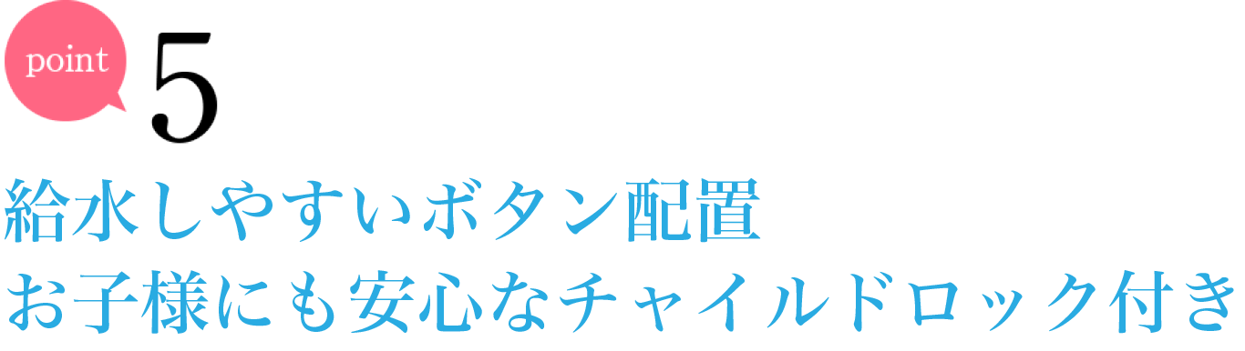 ボタン類はウォーターサーバーの上部に配置したことで給水時に操作しやすいデザインになりました。棚の上などに置けば小さなお子様の目線にはボタンパネルが入りづらく、いたずら防止に効果的です。さらにチャイルドロック付で解除には長押し2秒が必要なため万が一手に届いた場合にも安心です。